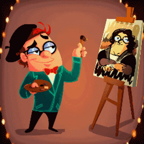 A cartoon artist from Catlab Interactive comically paints and alters a portrait of the Mona Lisa.