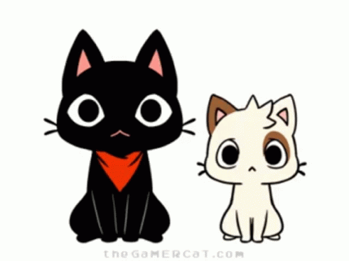 Animated black cat with red bandana and a white cat with brown spots hugging.