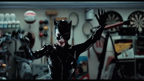 Michelle Pfeiffer as Catwoman (Selina Kyle) in her iconic black latex suit, wielding a whip in a garage.