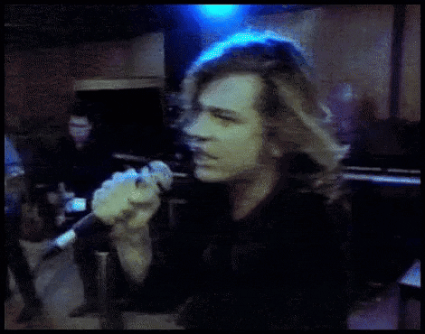 Michael Hutchence of INXS passionately singing 'Cause I Feel Good Tonight' into a microphone.