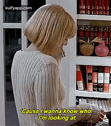 Drew Barrymore as Casey Becker in Scream, talking on the phone in front of a bookshelf, asking 'Cause I wanna know who I'm looking at.'
