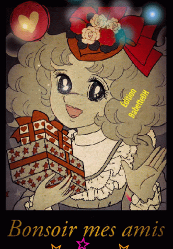 A charming cartoon girl with curly hair holds a gift box, wishing 'Good evening my friends' in French.