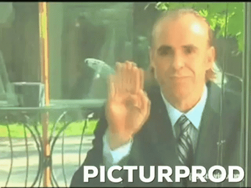 Man from Picturprod in a suit waves hello and makes an 'okay' gesture through a window.