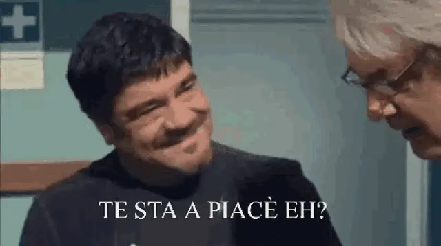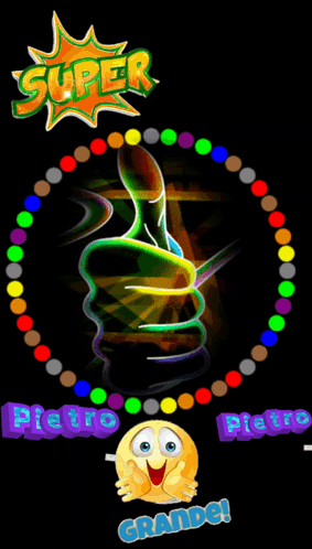 Cartoon smiley face gives a thumbs up with 'super pietro pietro grande' text.