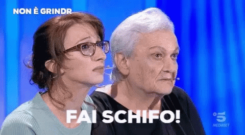 An older woman on 'C'รจ Posta Per Te' passionately yells 'Fai Schifo!' at someone, while a younger woman looks on.