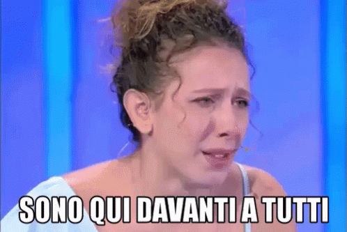 A woman cries emotionally on the Italian show 'C'è Posta Per Te', stating 'I am here in front of everyone'.