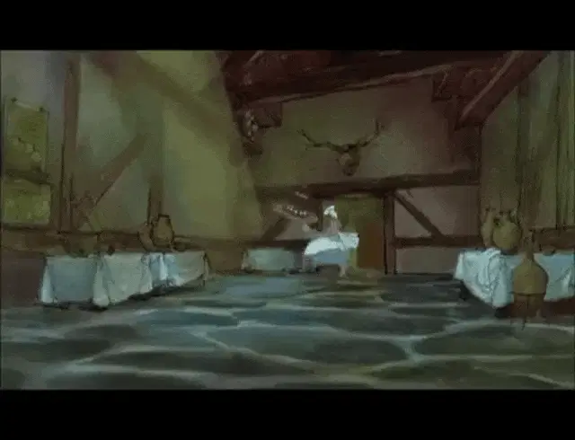 Ceasar, from Asterix, makes a grand entrance in a white toga and golden armor within an ancient palace.