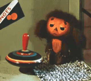 Cheburashka, the beloved Russian character, looks sad next to a spinning top, reflecting a melancholic mood.