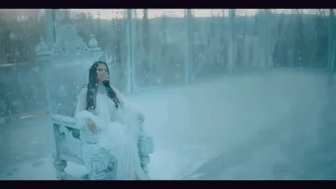 Ceca in a white dress and crown, sitting on an icy throne amidst a snowy landscape.