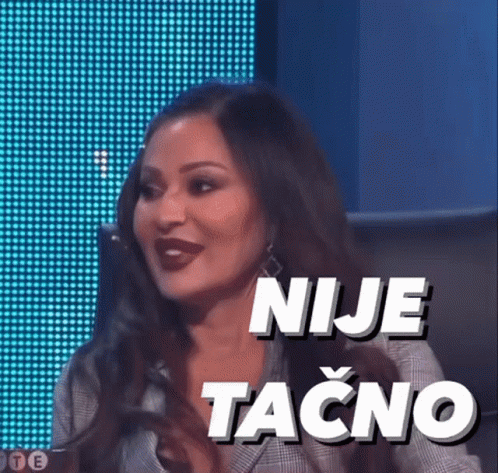 Serbian singer Ceca smiles as the text 'Nije Tačno' (It's Not True) appears prominently on a screen behind her.