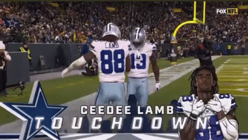 CeeDee Lamb and Michael Gallup celebrate a touchdown for the Dallas Cowboys on the football field.