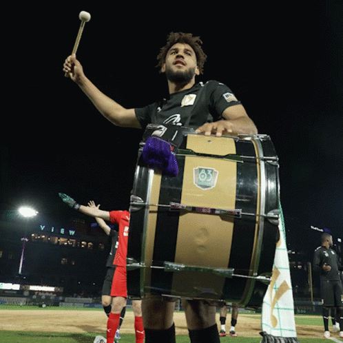 Jj Williams celebrates with a large bass drum, showing enthusiasm for 83United at the stadium.