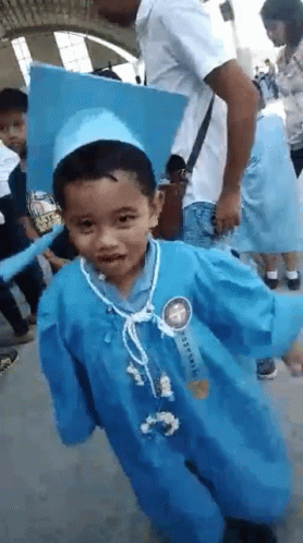 Young Klyde celebrates his graduation day in a blue cap and gown, smiling happily and making gestures.