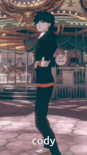 Cody, a character from Ai The Somnium Files, performs a silly dance in a suit in front of a merry-go-round.