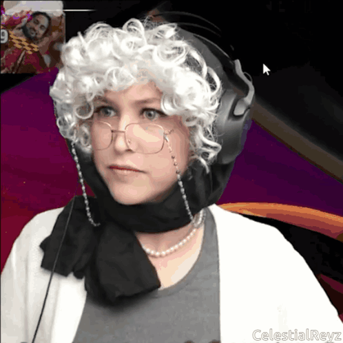 CelestialReyz portrays a charming grandma character, complete with a white wig, glasses, and pearls.