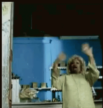 Celia Cruz joyfully dances and greets an old friend in a room with a blue wall, showing vibrant energy.