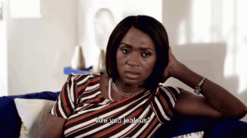 Celia on a blue couch, reacting to the question 'Are you jealous?' in a scene from Skeem Saam.