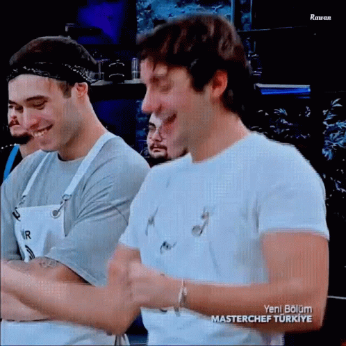 Cemal Can Canseven reacts excitedly during a MasterChef Turkey episode, smiling and celebrating.