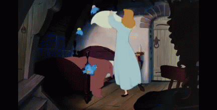 Cinderella, with the help of her bird friends, tidies up her bed in her charming attic room.