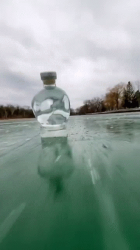 A unique skull-shaped bottle sits on a reflective icy surface under a cloudy sky.