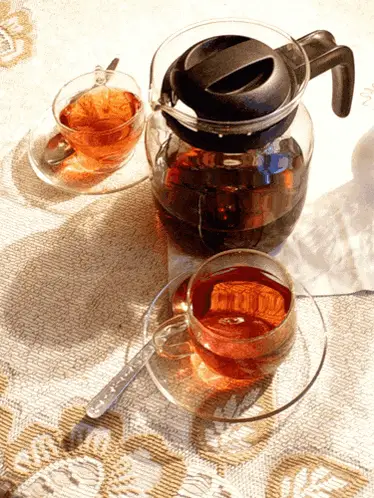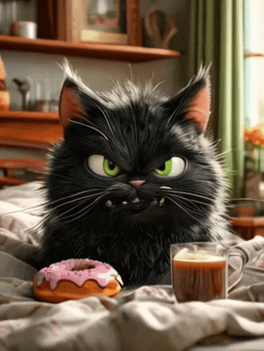 Grumpy black cat with bright green eyes sitting on a bed next to a pink donut and coffee.
