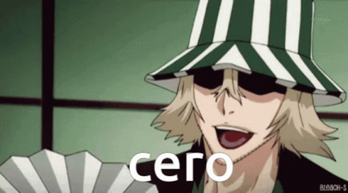 Anime character Cero Cerokaiser, from Bleach, in a striped hat holds a fan, with the word 'cero' displayed.