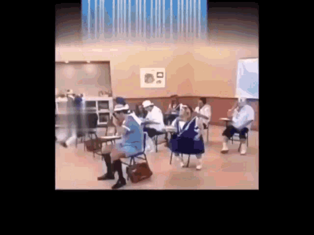 Characters from Cero En Conducta in a classroom setting, with one character taking photos and another reacting.