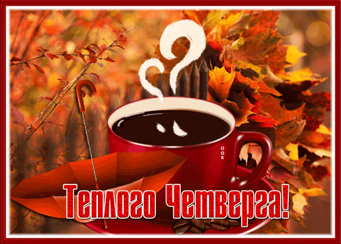 A steaming cup of coffee with autumn leaves and an umbrella, wishing a warm Thursday.