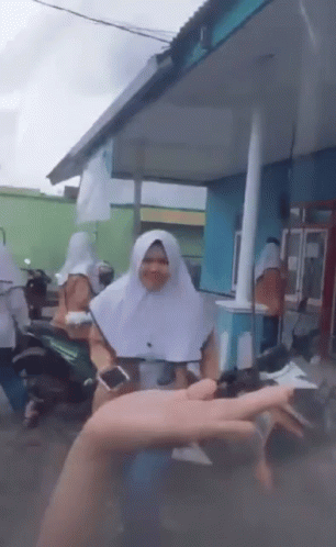 A young girl in a white hijab smiles and gestures playfully in front of a building, embodying a 'Spoil Girl' vibe.