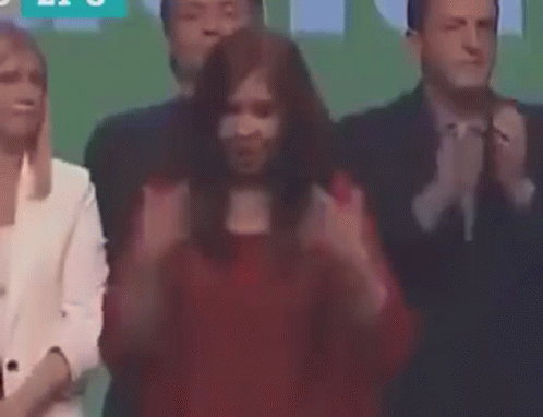 Cristina Fernández de Kirchner fanning herself in a red dress while people applaud.