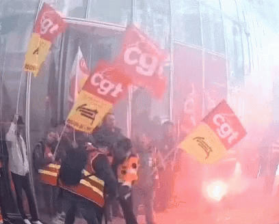 CGT Cheminots protest with flags and red smoke, demonstrating for workers' rights.