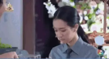 A woman in a pink tank top makes a series of expressive, annoyed, and surprised faces in a Thai drama scene.