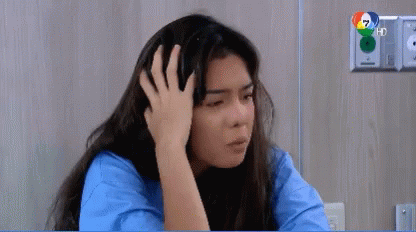 A woman in a blue shirt looks distressed, holding her head, possibly experiencing a headache.