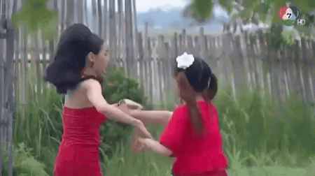 Two women in red dresses, one adult and one child, hold hands and run through a rural area, possibly from the Ch7 drama 'เพลงรักเพลงปืน'.