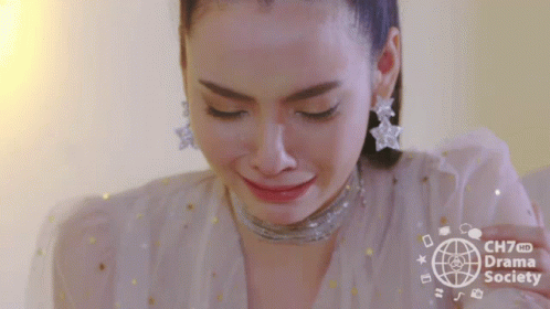 Mookda Narinrak crying with a choker and star earrings, from the drama ม่านบังใจ (Ch7drama).