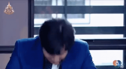 Mek Juti Jumroenketpratipe as a man in a blue suit, looking stressed in a scene from Ch7drama Fai Hima.