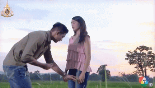 Weir Sukollawat kneels before Stephany in a field, a romantic moment from Ch7drama's Phubao Indy Yayee Inter.