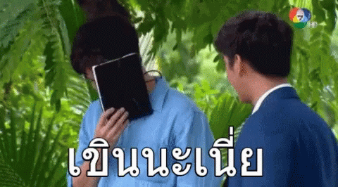 A man from a Ch7 drama covers his face with a tablet, appearing shy, while another man smiles beside him.