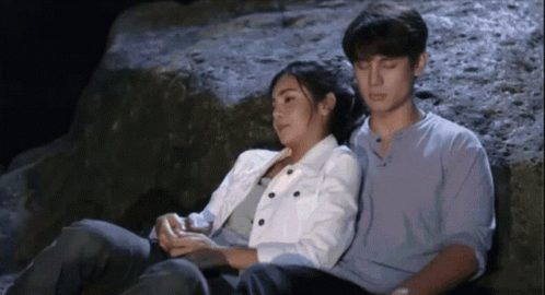 แบงค์ อาทิตย์ and ปูเป้ เกศรินทร์ share a tender, cozy moment together, leaning on each other in a dark setting.