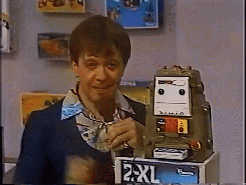 Chabelo introduces the vintage 2-XL robot, making hand gestures while speaking.