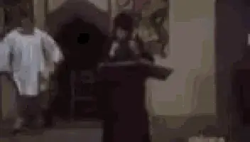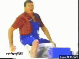 Chabelo, wearing blue overalls and a red shirt, sits on a blue block.