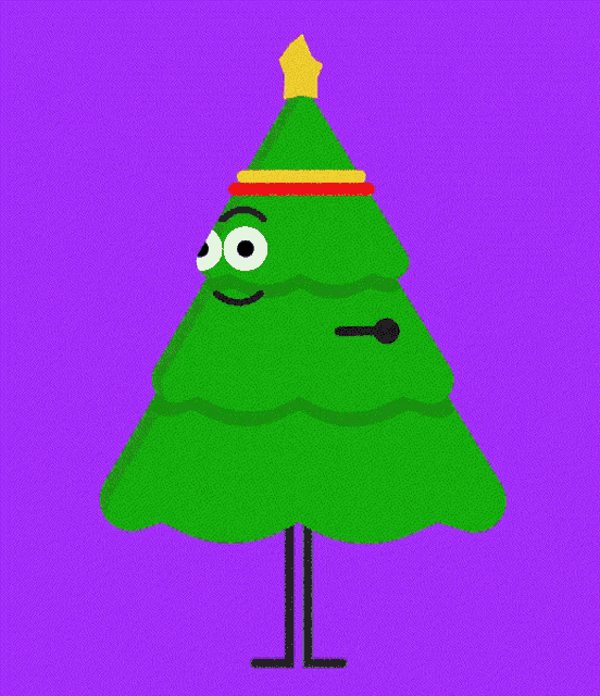 A cartoon Christmas tree character with a star and headband performs a lively chachacha dance against a purple background.