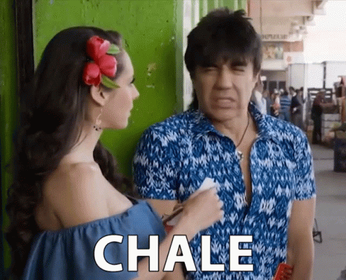 Adrian Uribe as El Vitor reacts with 'Chale' while talking to a woman, expressing frustration.