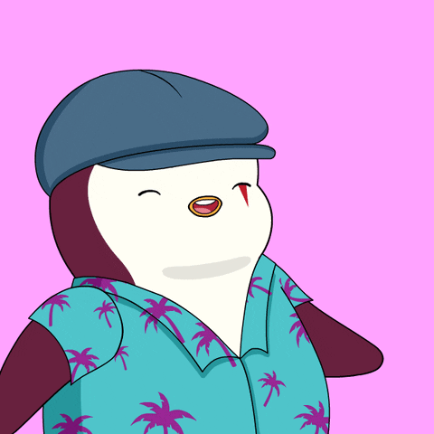 A pudgy penguin wearing a blue flat cap and a Hawaiian shirt with palm trees, ready for a challenge.