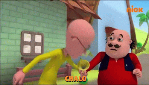 Motu and Patlu from the popular Indian cartoon series, with the word 'Chalo' displayed on screen.