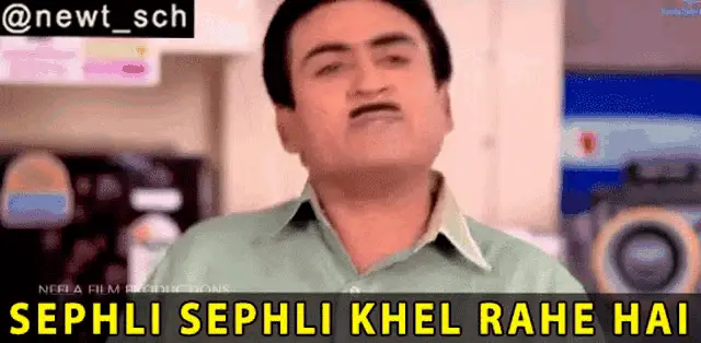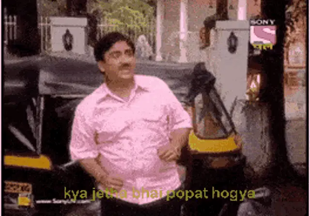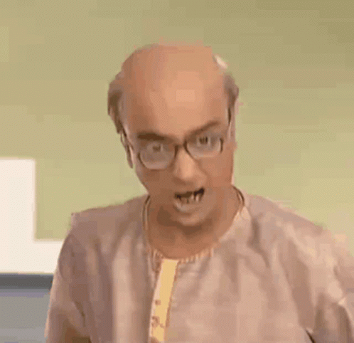 Champaklal, a bald man with glasses, makes an angry and funny face, showing a humorous expression.
