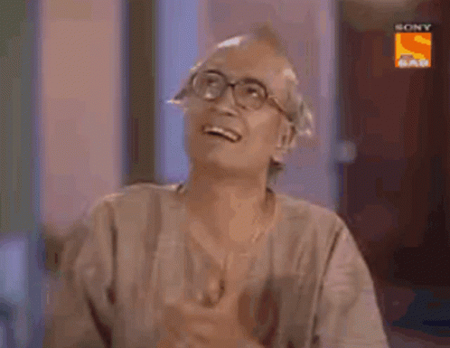 Champaklal from TMKOC laughing heartily and clapping with joy, wearing glasses and holding his chest.