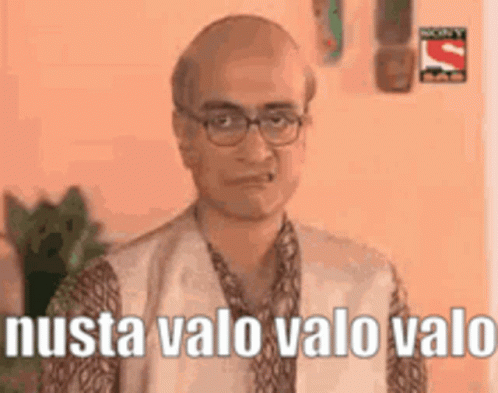 Champaklala from TMKOC says 'nusta valo valo valo' while wearing glasses and a vest.