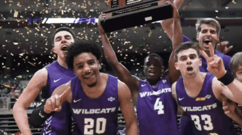 Abilene Christian Wildcats basketball team celebrating their championship victory with a trophy and confetti.