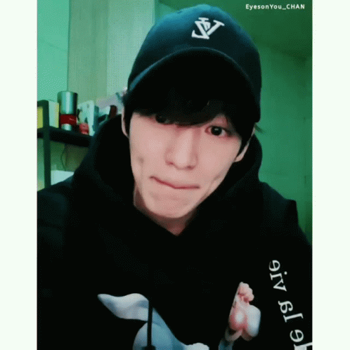 VICTON's Heochan in a black cap and hoodie, making a playful expression and licking his lips.